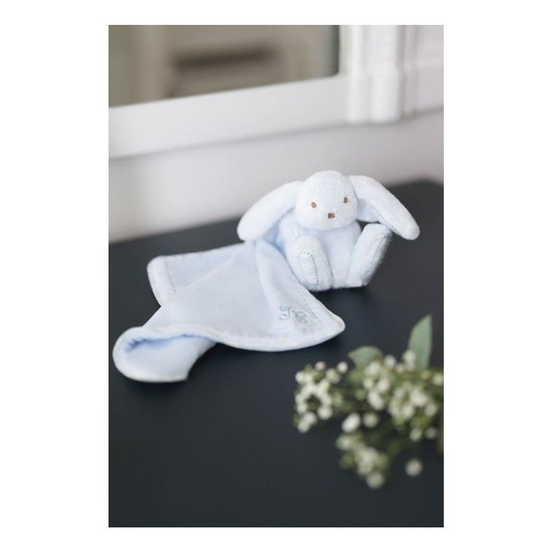 Peluche Augustin le lapin, en imitation fourrure et suédine accrochée à un carré en micro velours. Livrée dans une boîte Tartine et Chocolat.